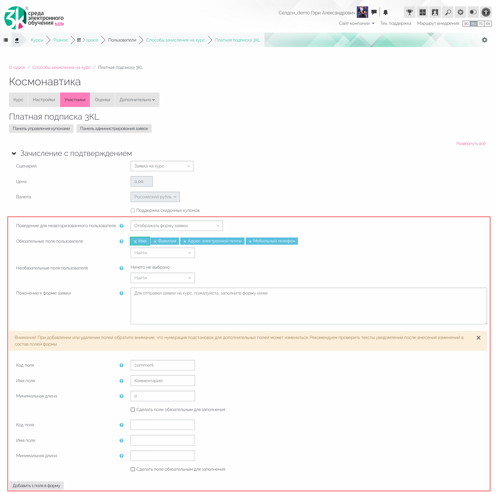 В плагин «Платная подписка 3KL» добавлена возможность подать заявку на зачисление на курс для неавторизованного пользователя. В форму заявки можно добавить поля профиля пользователя и кастомные поля.