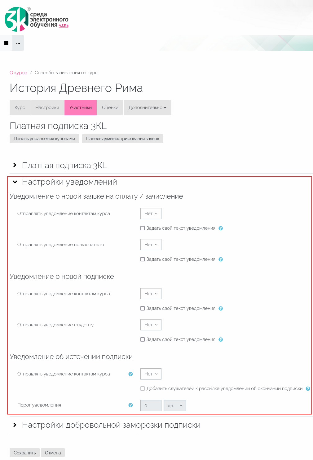 В плагин «Платная подписка 3KL» добавлен новый раздел настроек «Настройки уведомлений», доступный при создании или редактировании способа зачисления на курс. В раздел вынесены настройки уведомлений, рассылаемых студентам и контактам курса, а также добавлены новые настройки: #6253