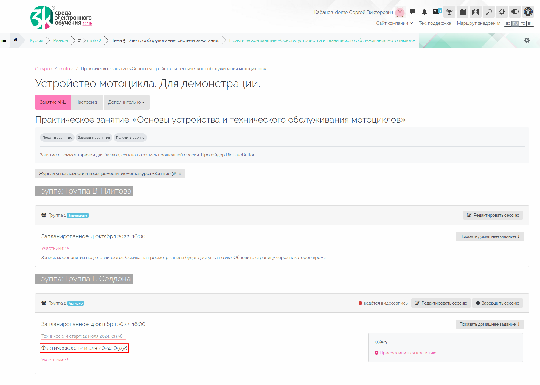 В элементе курса «Занятие 3КL» дополнена информация о начале мероприятия. Теперь, кроме запланированной даты, в интерфейсе сессии слушатели могут видеть время и дату фактического начала занятия, а преподаватели - еще и время технического старта сессии. #6328