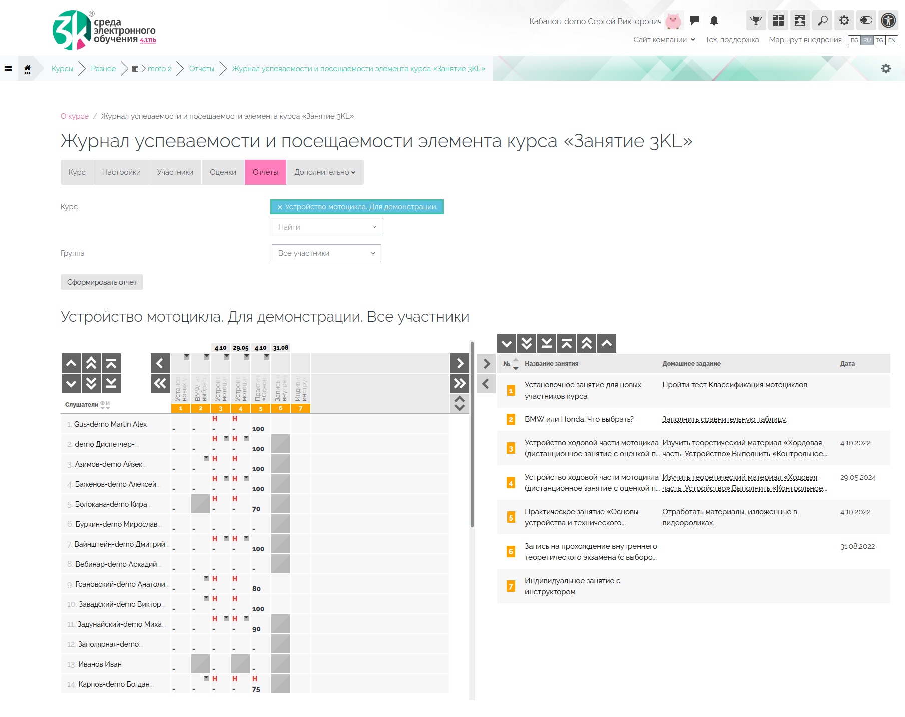 В журнале успеваемости и посещаемости элемента курса «Занятие 3КL» реализована возможность печати журнала. Дополнительно выполнена оптимизация кода, что позволило устранить замедление при открытии журнала с большим объемом данных. #6354