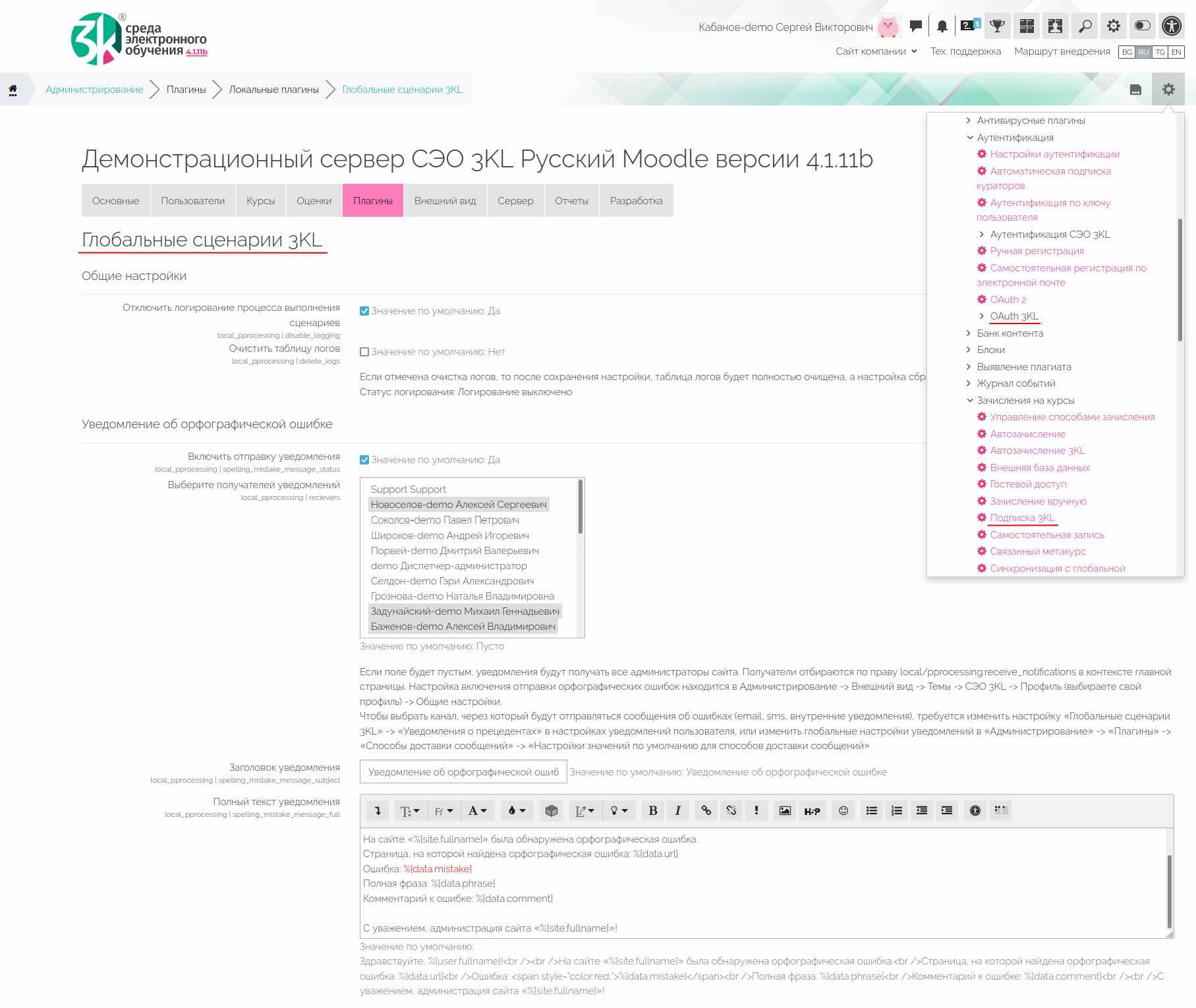 Страница настроек локального плагина «Глобальные сценарии 3КL» (ранее - Панель обработки прецедентов)
