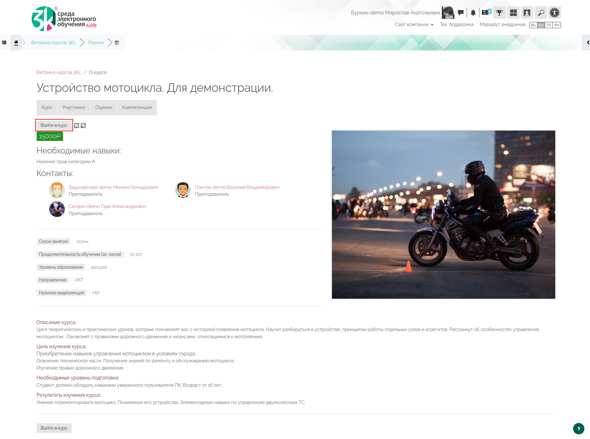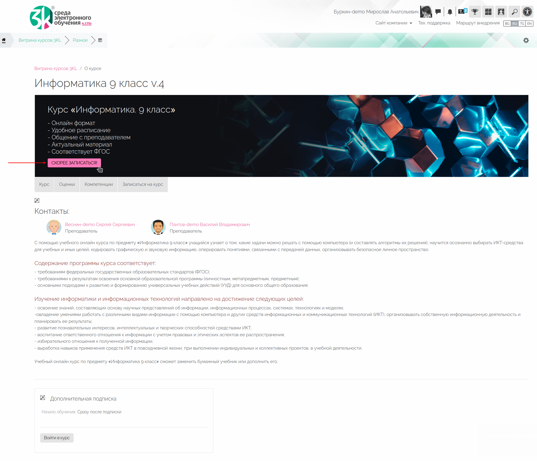 На странице описания курса появилась возможность добавления дополнительной кнопки для быстрого перехода к записи на курс (входа в курс). Кнопка может быть реализована стандартно, с помощью настроек курса (или витрины курсов) или кастомно - с помощью javascript, вставкой специального кода. #6279