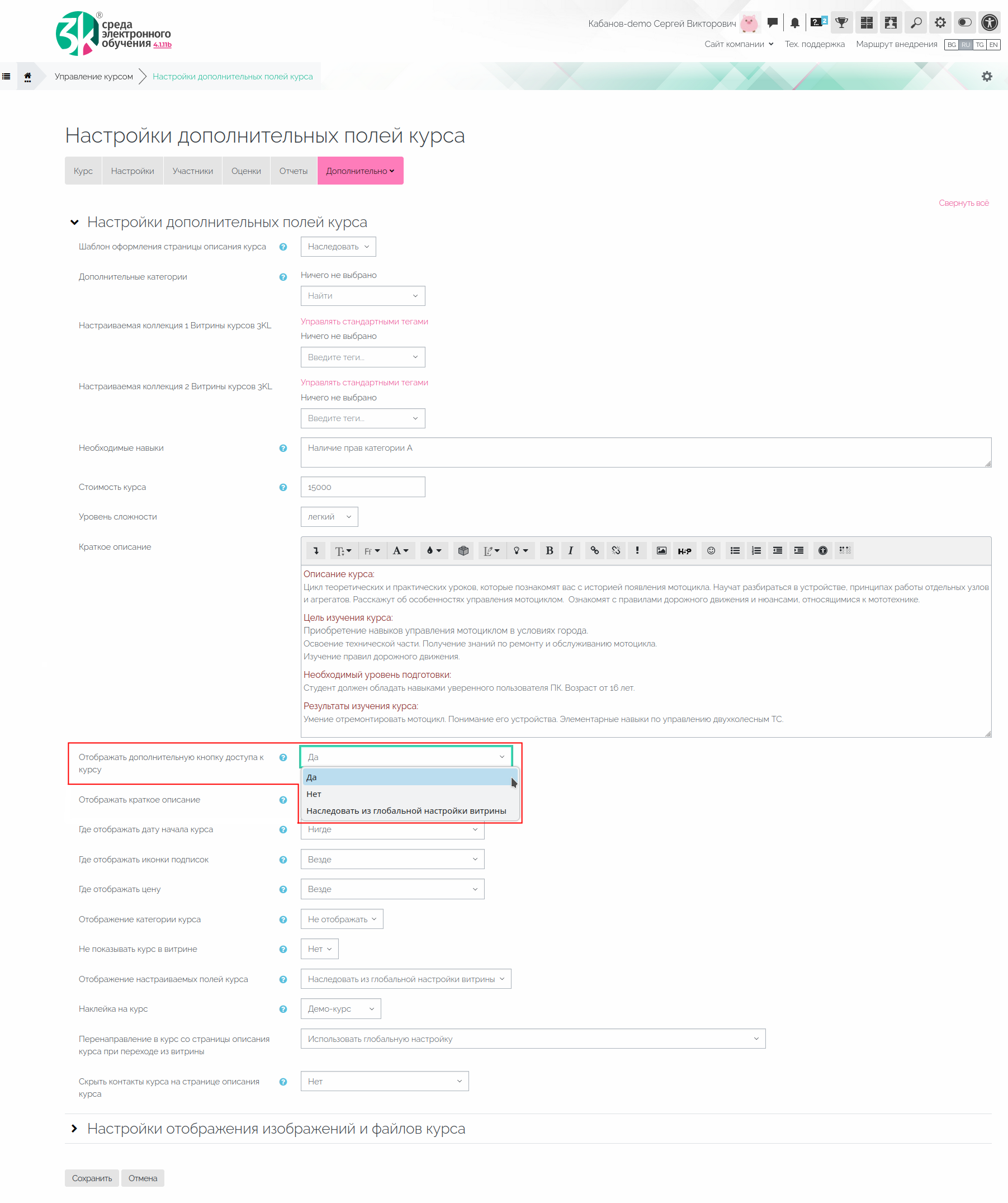 Настройка «Отображать дополнительную кнопку доступа к курсу» на странице «Настройки дополнительных полей курса»