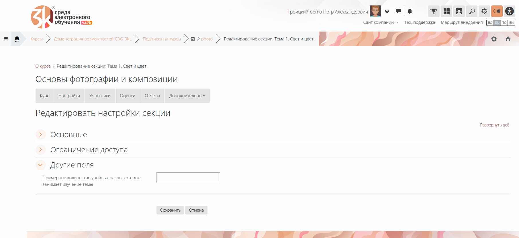 Для элементов курса и секций курса добавлена возможность создания пользовательских полей. Функционал реализован в плагине «Техническая поддержка СЭО 3KL» в рамках разработки функционала по передаче цифрового следа. #7648