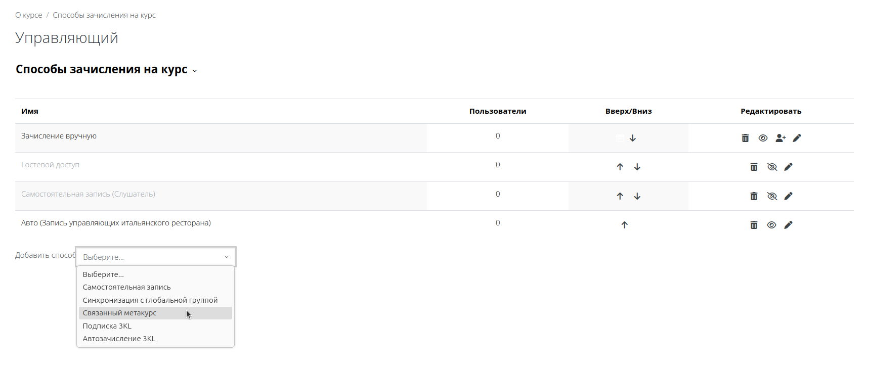 4) Далее преподаватель настраивает способы зачисления для курсов «Управляющий», «Стартовый курс итальянского ресторана», «Корпоративный этикет», «Работа с документами», последовательно выполняя для каждого курса настройки, описанные в этом пункте и далее. Для начала он переходит к курсу «Управляющий».