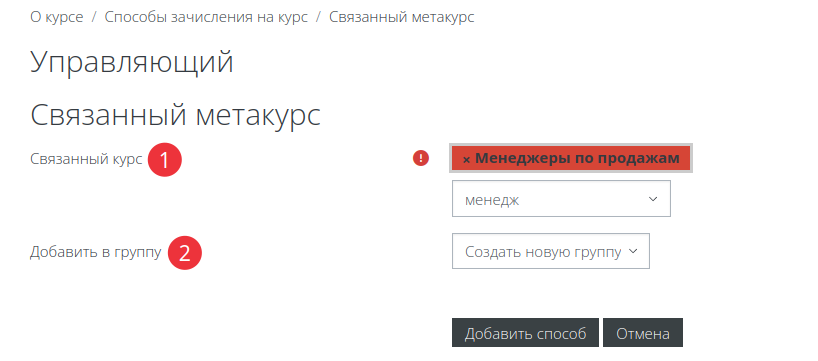 1) Преподаватель создает новый курс без учебного контента «Менеджеры по продажам» (метакурс), в который будут подписаны все менеджеры организации (Рис. 2).